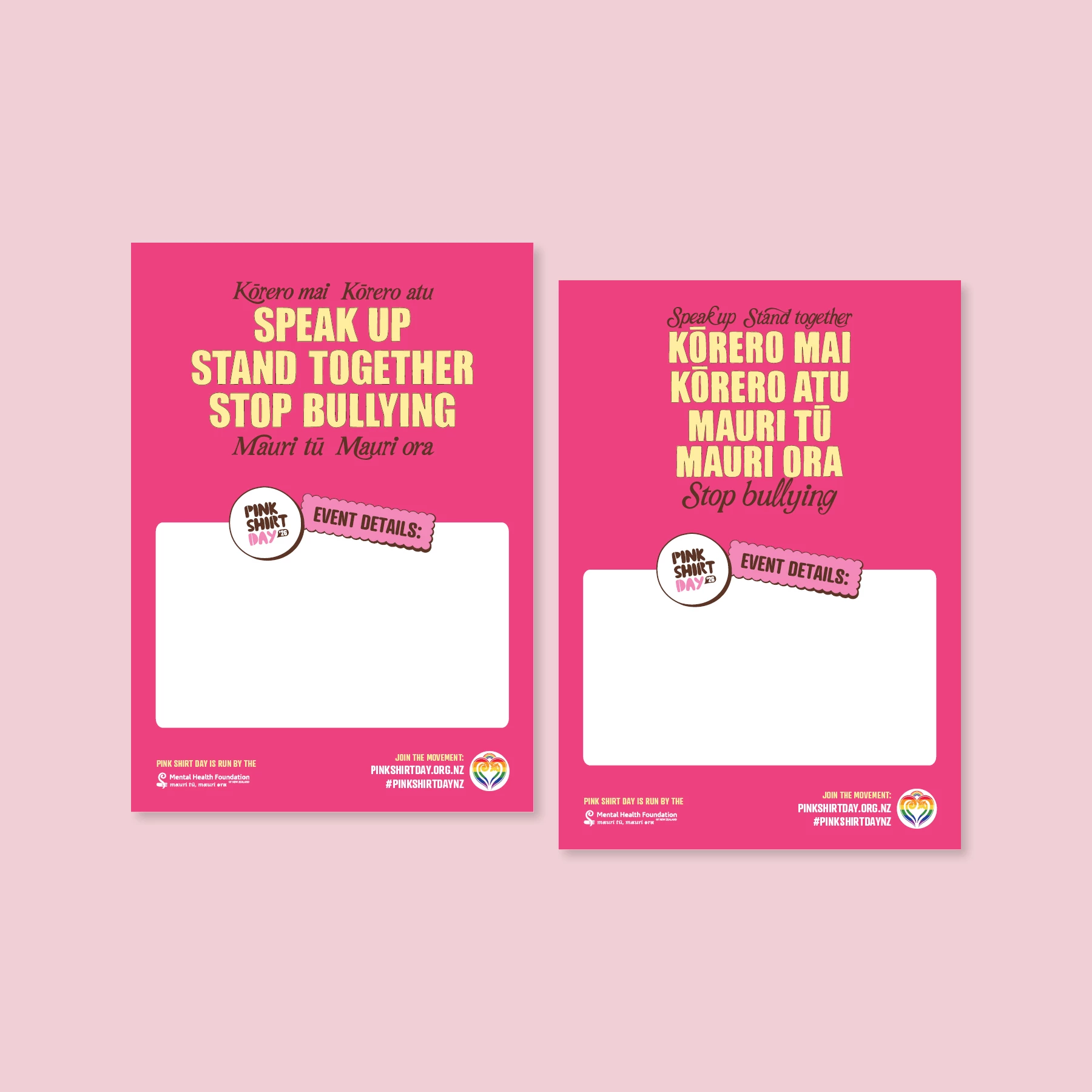 Te Reo Māori and English event posters to help you promote your Pink Shirt Day.
