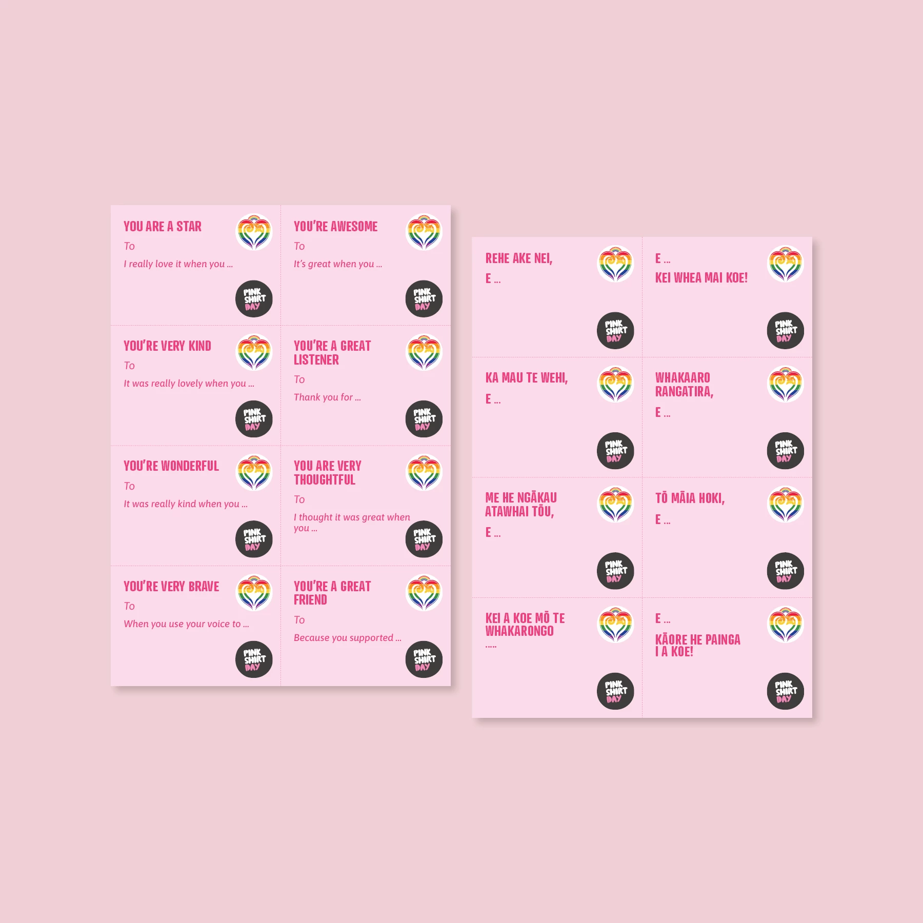 Celebrate kindness by giving out compliment cards to students on Pink Shirt Day - available in English and Te Reo Māori.